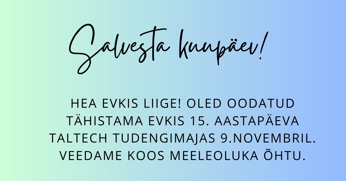 2023 aasta novembris möödub 15 aastat Eesti Veevarustuse ja Kanalisatsiooni Inseneride Seltsi (EVKIS) asutamisest. Selle juubelihõngulise verstaposti tähistamiseks kutsume kõiki seltsi liikmeid võtame aja ja vaatame koos tagasi toimunule ning ka edasi tuleviku poole. Teeme seda kõike ühiselt koos 9. novembril TalTechi tudengimajas algusega kell 19:00.   Kõik liikmed on […]